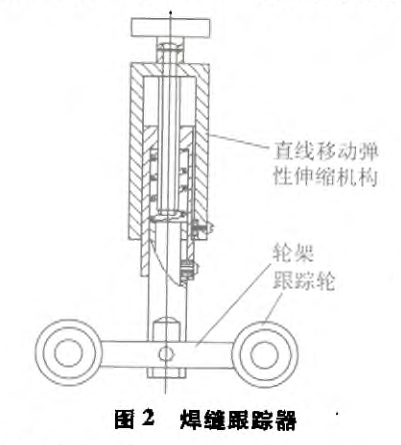 焊縫跟蹤器是保證焊接質(zhì)量的關(guān)鍵部件,依靠它為焊接小車行走強制導向,從而保證焊槍2始終不偏離焊縫。它由兩個導向輪、一個輪架、一套直線移動彈性伸縮機構(gòu)組成,結(jié)構(gòu)如圖2所示。焊縫跟蹤器7通過豎直調(diào)整夾具9與安裝在焊接小車前端的水平調(diào)整裝置8相連。工作時焊縫跟蹤器的兩個跟蹤輪騎在焊縫中,依靠焊縫為其導向,并在彈性壓力下,兩輪始終沿焊縫滾動,通過機械強制力使焊接小車跟隨其始終與焊縫保持等距行走。