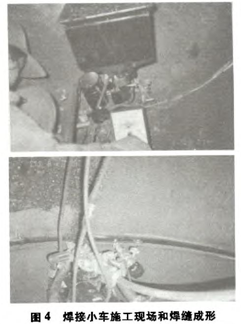 (4)焊接過程中,焊縫跟蹤器7將始終為焊接小車導向。在焊接臨近頭尾相接時。跟蹤輪將失去焊縫依托,但靠原已形成的導向作用延續(xù),焊接小車仍會沿焊接反向繼續(xù)前進直至與焊接起點重合。完成焊縫對接后,按下焊接操作盒10上的“停止焊接”按鈕,內(nèi)環(huán)縫焊接結(jié)束。焊接小車施工現(xiàn)場和焊縫成形如圖4所示