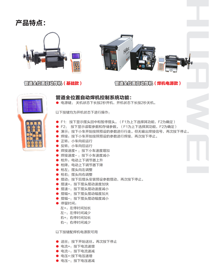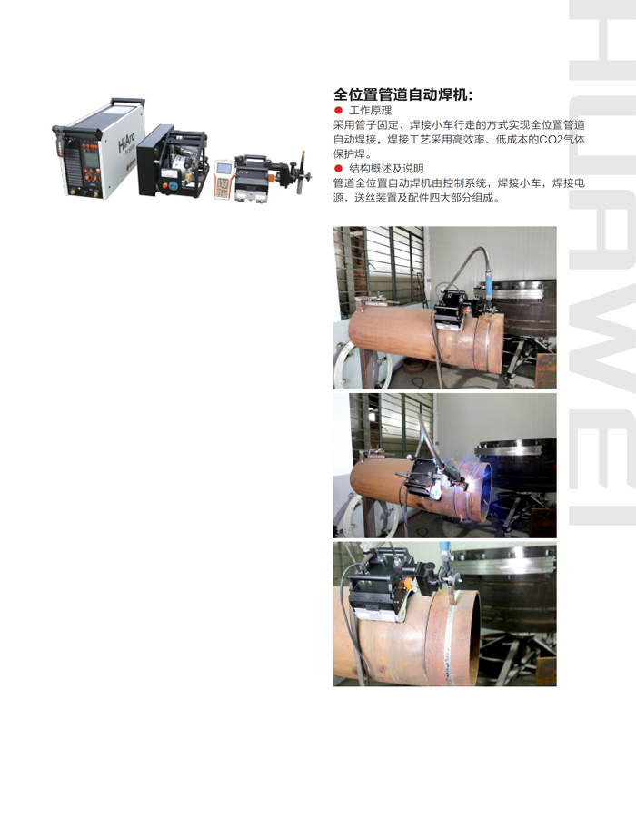 ● HK-11WG 管道全位置自動(dòng)焊機(jī)采用管子固定、焊接小車行走的方式實(shí)現(xiàn)管道的全位置自動(dòng)焊接,焊接工藝采用高效率、低成本的熔化極氣體保護(hù)焊;● HK-11WG 管道全位置自動(dòng)焊機(jī)主要特點(diǎn)在于設(shè)計(jì)輕巧便于攜帶,特別適合于施工現(xiàn)場(chǎng)的管道全自動(dòng)焊接,具有操作簡(jiǎn)單易學(xué)、焊接速度快、生產(chǎn)效率高、勞動(dòng)強(qiáng)度低、焊接性能穩(wěn)定等特點(diǎn)。● 設(shè)備適用范圍廣,管徑Φ150mm以上的管道均可適用,理論上無(wú)焊接壁厚限制,厚壁管可采用多層多道焊接。